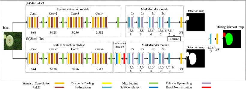 首次提出了检测和定位的操作,作为一个新的feature,提供了可以生成大量数据集的方法,提出了使用深度神经网络的结构,构建端到端的模型,通过visual artifacts和visual similarities两个模块分别定位潜在的篡改区域和copy-move的区域。一个是Mani-net,一个是Simi-net,最后做一个Fusion。