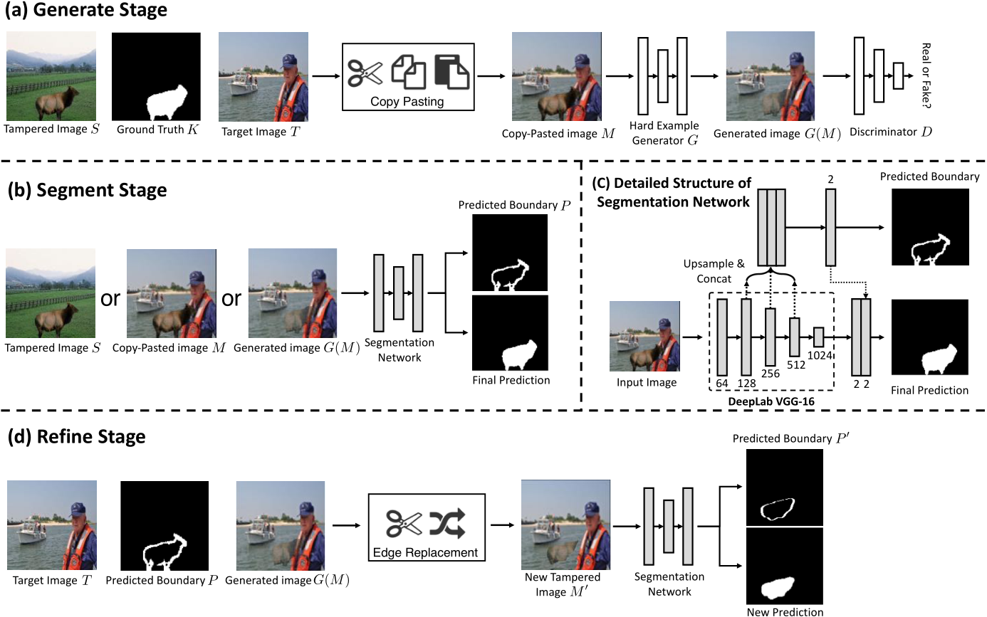 由于现阶段训练数据不够,打标签也很繁琐,所以从image blending的传统工作上入手,提出了一个生成器,用来生成不同篡改类型的图片,进一步提高泛化能力,同时不断训练让算法更加关注在边界痕迹上,生成更加难以被网络识别的图片,以及一个分割和细化网络用来关注篡改的痕迹,而不是语义内容,来提高识别的能力。
