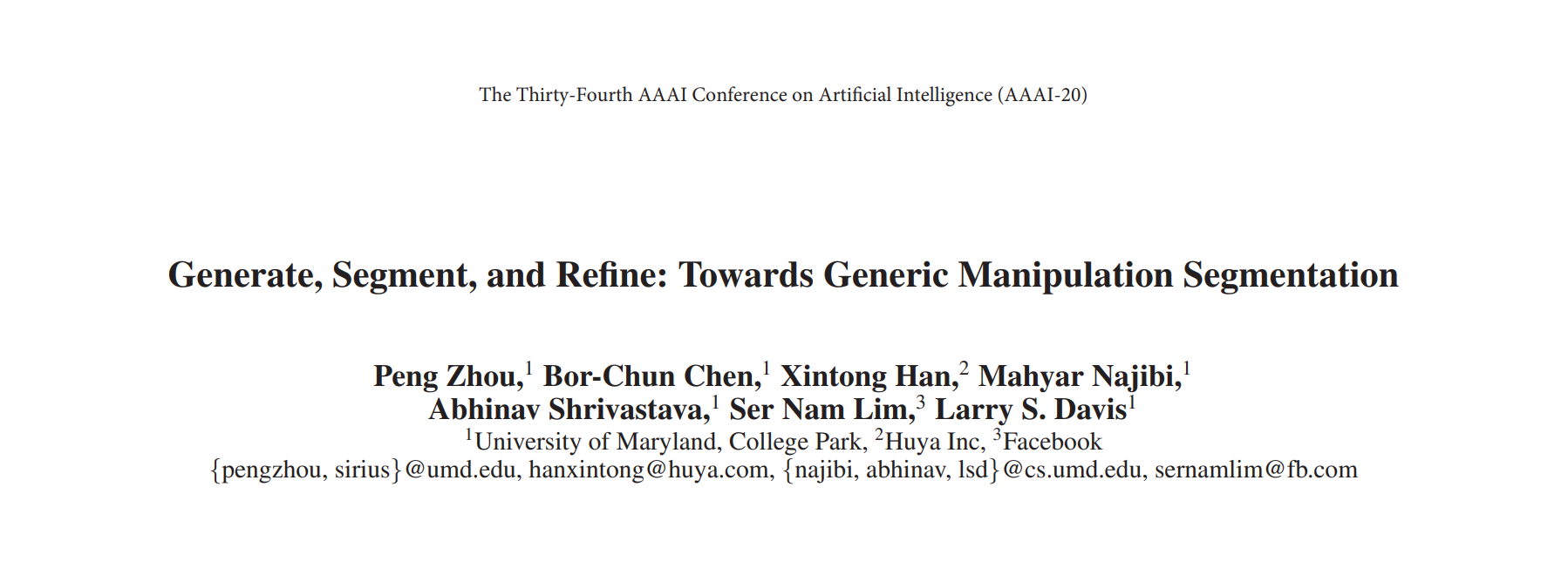 Peng Zhou, Bor-Chun Chen, Xintong Han, Mahyar Najibi, Abhinav Shrivastava, Ser-Nam Lim, and Larry Davis. 2020. Generate, Segment, and Refine: Towards Generic Manipulation Segmentation. Proc Aaai Conf Artif Intell 34, 07 (2020), 13058–13065. DOI:https://doi.org/10.1609/aaai.v34i07.7007