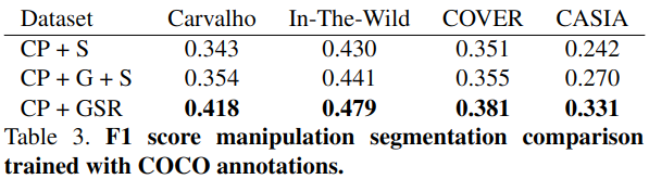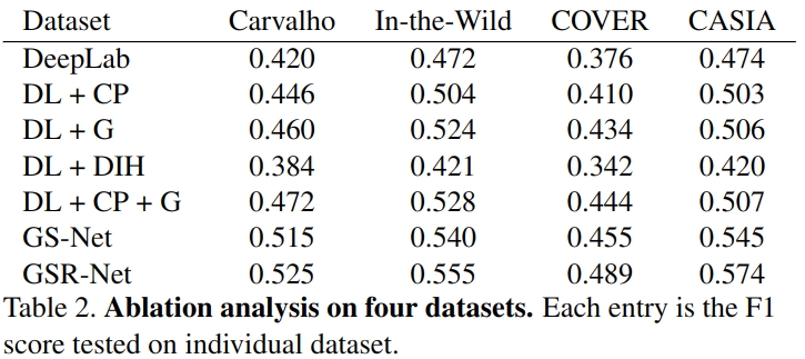 消融研究上,就是考虑CP(copy-paste),CP和G(用了copy-paste和生成器生成),还有用image harmonzation(DIH),以及不包括refine net,(DL+CP+G)没有学习篡改痕迹,所以泛化能力很有限。