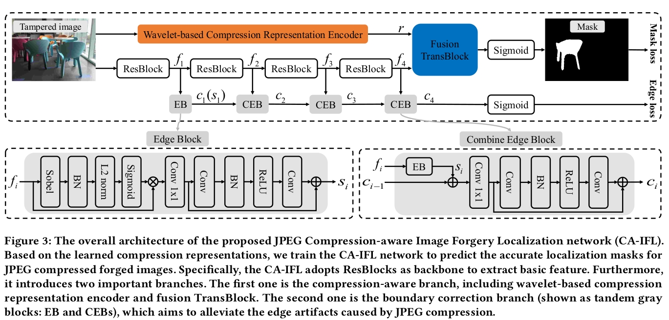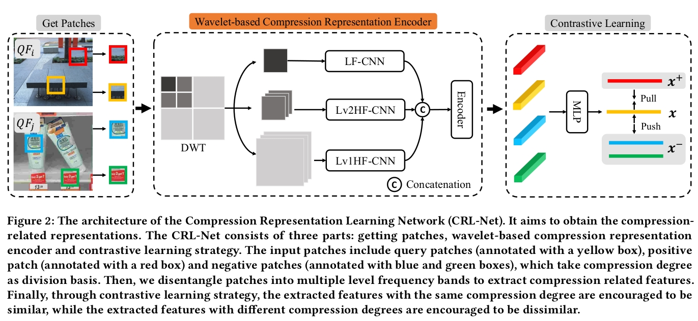 作者提出的问题是现有的方法在应对被JPEG压缩后的图片检测性能表现急剧下降,于是作者提出基于小波压缩的特征学习,通过小波集成对比学习来学习不同压缩等级的特征表示;再通过一个JPEG压缩感知的网络,来处理不同压缩等级的篡改图像,
