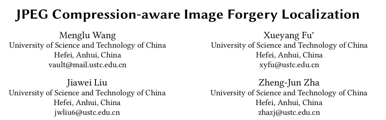 Wang, M., Fu, X., Liu, J., & Zha, Z.-J. (2022). JPEG Compression-aware Image Forgery Localization. Proceedings of the 30th ACM International Conference on Multimedia, 5871–5879. https://doi.org/10.1145/3503161.3547749