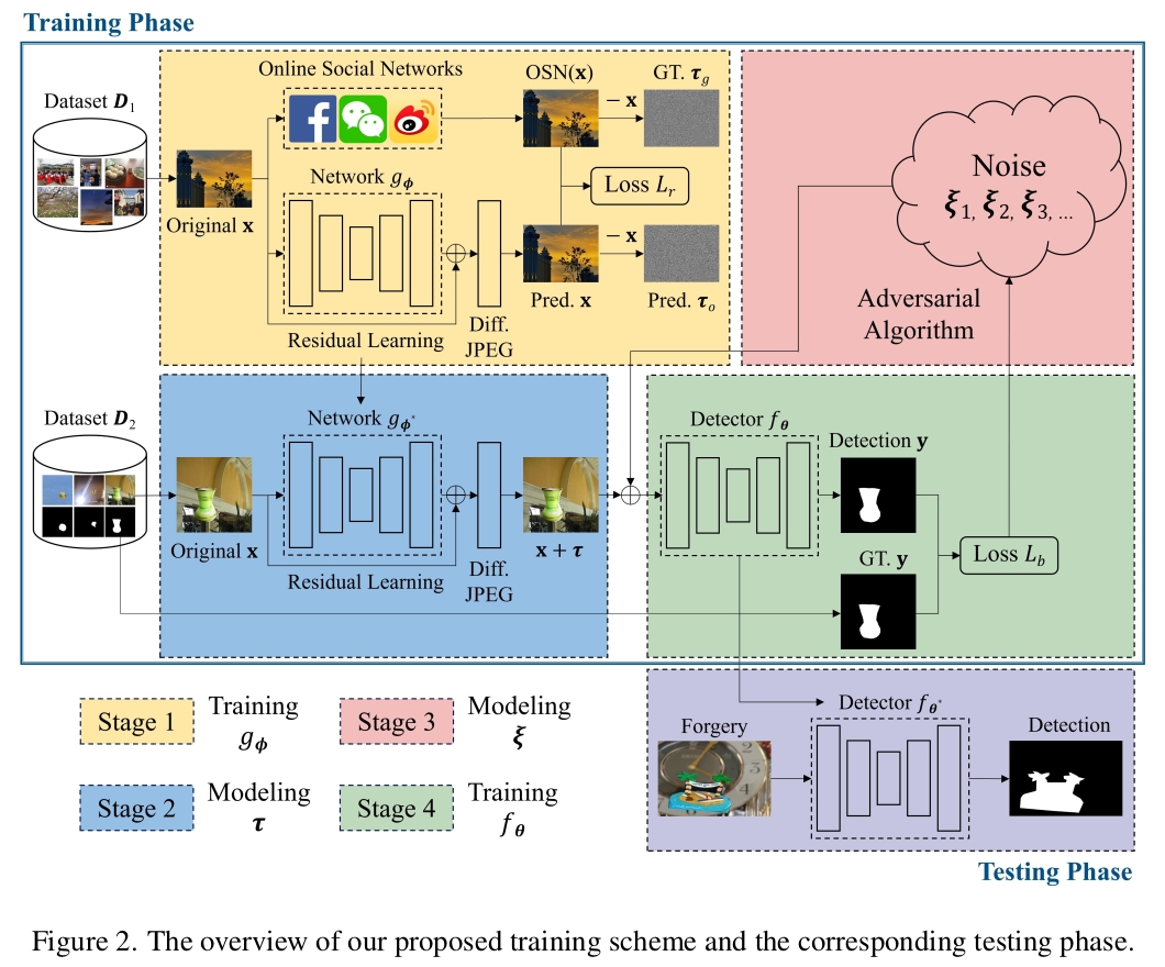 由于在社交网络上的对不同的不同损失情况,对一些篡改检测的方法带来了一些挑战,为了应对在线社交网络的图片压缩行为,作者提出的方法是一个噪声建模的方案,将模拟的噪声整合到一个训练框架中,整合的噪声有两个部分,第一部分是可预测的,像是JPEG压缩等带来的;第二部分是讨论不同的在线社交网络赋予的未知的噪声和在不同社交网络上训练测试带来的差异。但是第二部分的噪声无法从信号本身的角度建模处理,所以作者使用对抗噪声的概念来进行建模,其本质就是一些无法察觉的扰动对模型性能的影响。