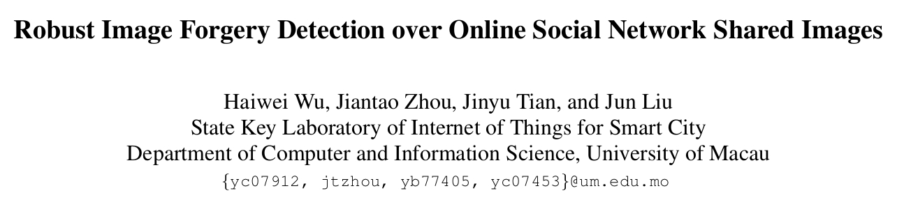 Wu, H., Zhou, J., Tian, J., & Liu, J. (2022). Robust Image Forgery Detection Over Online Social Network Shared Images. IEEE/CVF Conference on Computer Vision and Pattern Recognition (CVPR), 13440–13449.