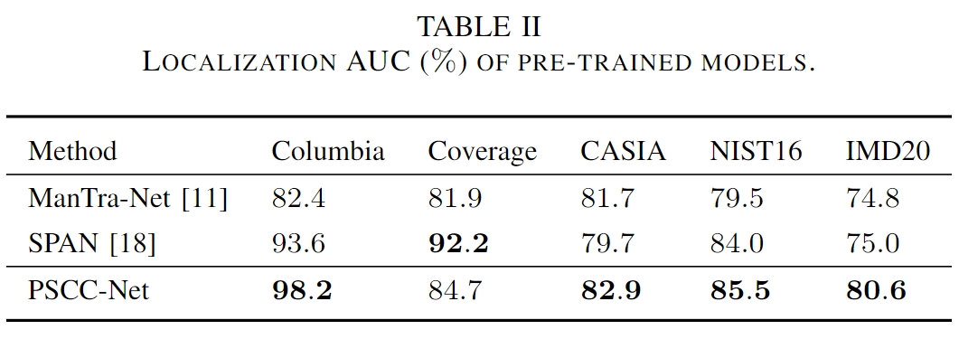 X. Liu, Y. Liu, J. Chen, and X. Liu, “PSCC-Net: Progressive Spatio-Channel Correlation Network for Image Manipulation Detection and Localization,” Ieee T Circ Syst Vid, vol. PP, no. 99, pp. 1–1, 2022, doi: 10.1109/tcsvt.2022.3189545.