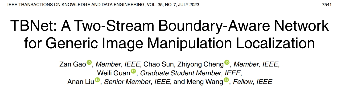 Gao, Z., Sun, C., Cheng, Z., Guan, W., Liu, A., & Wang, M. (2022). TBNet: A Two-Stream Boundary-Aware Network for Generic Image Manipulation Localization. In IEEE Transactions on Knowledge and Data Engineering. IEEE.