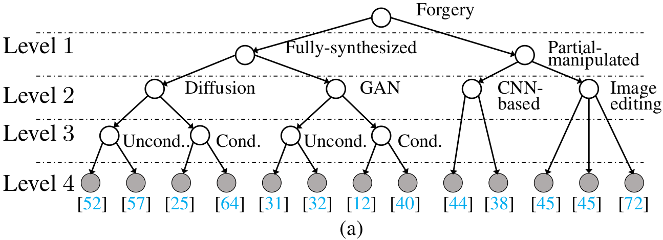 作者提出了一种多层次细粒度的图像篡改检测和定位方法,它不仅仅针对传统的图像编辑技术带来的伪造,同时也对使用GAN或者Diffusion Model等方法的DeepFake篡改,都能起到作用,这是目前所提出的篡改检测的方法里面一个比较新的尝试。而为了实现能够同时用一套结构检测和定位两种大类型的伪造,作者重点介绍了用多个标签来表示图片的篡改类型,而篡改类型也以多个层次给出(四个),每一层对应篡改类型的每一个标签,同时层之间不是简单的铺平,作者也考虑到了之间的依赖关系,具体是像树的结构一样。作者表示对篡改类型的检测,是可以作为定位的先验知识,因为不同的篡改类型,往往会与它作用的伪造区域有关,所以对篡改类型进行分类是能起作用的。在本文中,作者对篡改类型的分类从第一层image-editing 和 CNN-synthesized两种大分类到第四层的具体某一种方法等多个标签类型。同时,针对要对两种伪造类型进行检测,作者设计了一个数据集,包含了传统篡改的和用deepfake进行篡改的大型数据集。