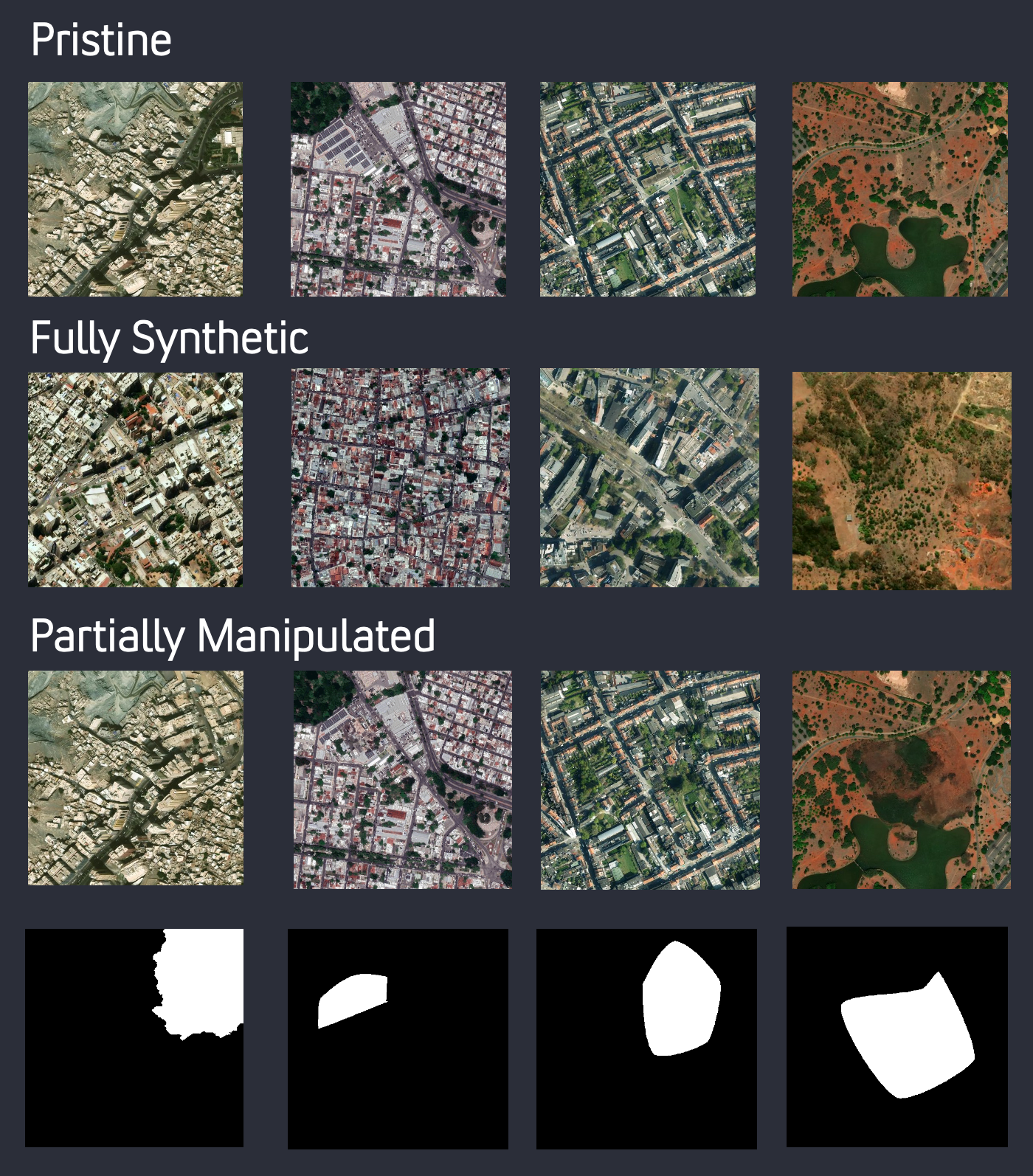 我会怎么想现在deepfake这么火,怎么会还有人检测传统的图片编辑伪造呢;那可以问的就是,那现在AIGC这么火,为什么还在检测deepfake,当然deepfake在某称程度上大概和AIGC是重合的,还有一点是,在检测deepfake的算法里面,我们经常看到的数据集是什么,这是我在看Arxiv上面的一篇文章(Discrepancy-Guided Reconstruction Learning for Image Forgery Detection)里面的一张结果对比图,虽然论文的标题也是image forgery detection,但是比较的方法和对应的评估的数据集,可以看到其中FF++HQ ICCV 2019, FF++LQ, Celeb-DF CVPR 2020, WLD MM 2020, DFDC, 这四个数据集全部都是人脸,但是我们现实世界里面的篡改伪造绝对不是只在人脸上面进行伪造,包括像我最近看到的一篇论文,Synthetic and Manipulated Overhead Imagery For Forensics Research, 这篇论文专门研究了俯瞰图片的篡改,篡改类型是inpainting,图像修复,image inpainting如下图所示。