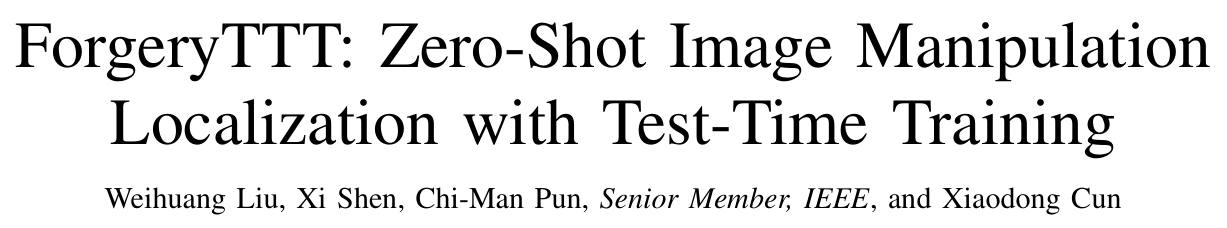 Liu, W., Shen, X., Pun, C.-M., & Cun, X. (2024). ForgeryTTT: Zero-Shot Image Manipulation Localization with Test-Time Training. In arXiv.