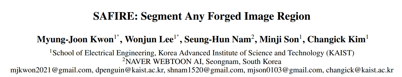 SAFIRE: Segment Any Forged Image Region Myung-Joon Kwon1*, Wonjun Lee1*, Seung-Hun Nam2, Minji Son1, Changick Kim1 1School of Electrical Engineering, Korea Advanced Institute of Science and Technology (KAIST) 2NAVER WEBTOON AI, Seongnam, South Korea [email protected], [email protected], [email protected], [email protected], [email protected]