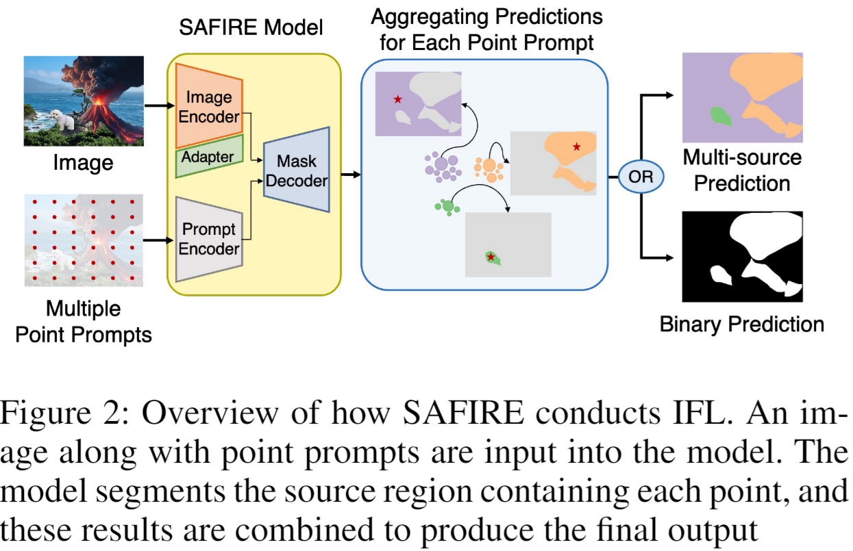作者将篡改图像按照源头进行分区这一更基础的方式来处理,而不是用二元分割的方式将真实区域标签0,篡改标签1。使用点提示 point prompt 的方法,图片上的每个点,都用于分割包括它自身的源区域,这样可以将图片分成多个不同源头的区域。如下图所示, SAFIRE 是将图片根据图片的来源进行分割,通过区域与区域的对比预训练来引导编码器可以高效地为源分区嵌入潜在的信号,通过训练以准确的预测源区域是否包含每个点,然后来判断一张图片是单独被拍摄的,还是 AI 生成的,或者是有其他图片参与进来的传统篡改。