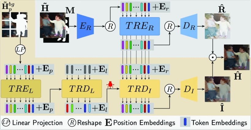 解构的HT,就是把图片的光照illumination 和 反射 reflectance 分开考虑,作为两个pathway进行处理,先去用transformer生成伪反射的图片,再生成伪光照的图片,然后再进行融合。作者是基于固有图片的属性以及Retinex理论所产生的这样的双分支,解构的transformer的想法。