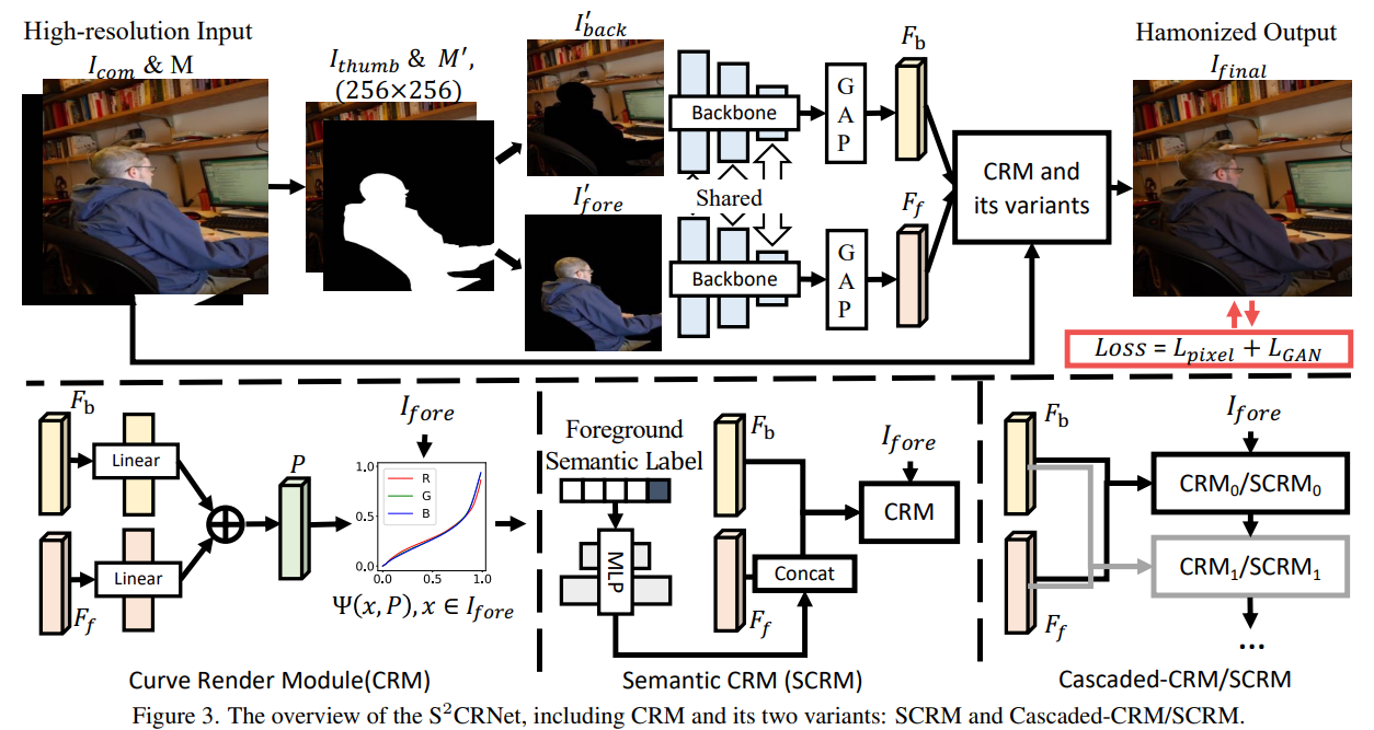输入一张高解析度的图片,以及它的前景二分掩码图,首先生成它的缩略图,接着进行空间分离的特征编码,通过二分掩码图,将缩略的合成图分成前景和背景,然后用一个共享的编码器分别提取对应的空间分离特征。然后将提取的前景特征和背景特征结合,经过CRM以及它的变体的模块,得到最后的颜色曲线参数。