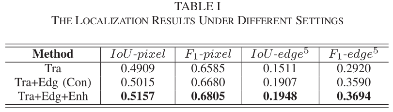 Ablation是只在CASIA V2.0上实验,ablate了只用篡改特征;使用篡改特征和边缘特征,但是两种特征结合只是不同的连接;以及使用两种特征同时用增强模块进行连接。