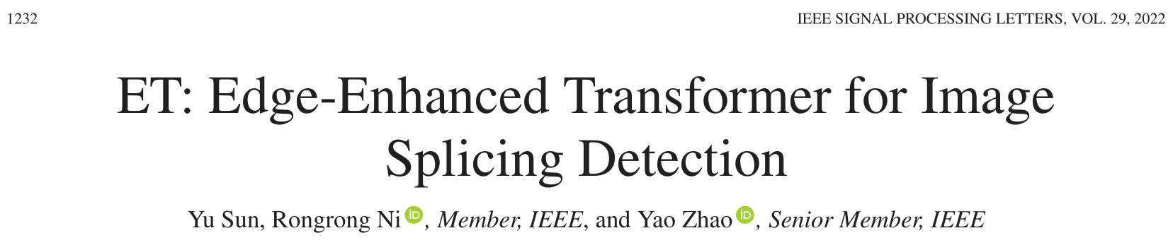 Sun, Y., Ni, R., & Zhao, Y. (2022). ET: Edge-Enhanced Transformer for Image Splicing Detection. In IEEE Signal Processing Letters (Vol. 29, pp. 1232–1236). IEEE. https://doi.org/10.1109/LSP.2022.3172617