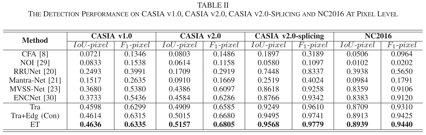 可以看到,结果都是比较的网络里面最好的,CFA和NOI是传统方法,Mantra-Net是直接报告了论文里面它自己写的结果,因为Mantra-Net说是在自己的未公开数据集上训练的。