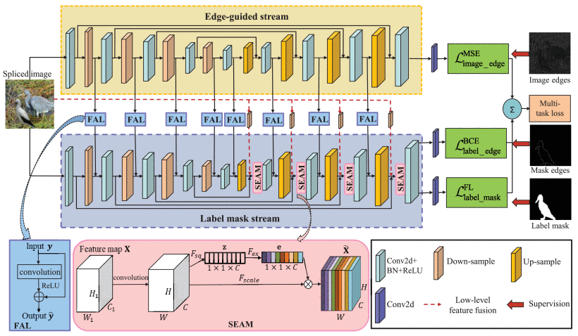 主要的思路就是在特征提取/特征表示的时候,采用的新的元素去提取特征;1. 是使用了image edge(图像边缘??),结合label mask和mask edge;2. 是以往的篡改检测,要不就是只处理了浅层的low-level特征,要不就是只关注了深层的high-level 特征,这次作者把他们fuse了,方法就是使用multi-task learning,同时配以squeeze and excitation attention modules(SEAMs) (挤压和激励,就是卷积的一种方法,就跟ASPP类似那种,有channel-wise squeeze-and-excitation modules, 可能也有layer-wise,spatial-wise;具体就是:Squeeze-and-Excitation Block,可以概括为自注意力机制) 都是为了更好的特征表示;3. 是针对提出的新的使用的image edge对应的loss策略。