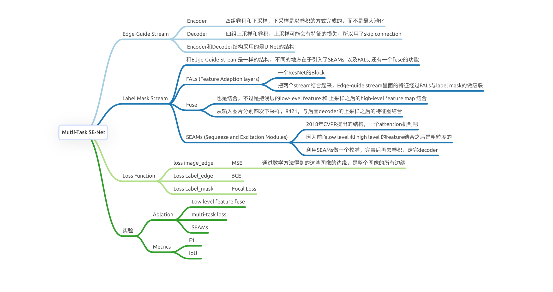 总体是一个多任务学习的网络结构,分成了两个stream,一部分是edge-guided stream, 另一个是Label Mask Stream,在边缘引导的这一个网络流中,采用的结构是U-Net的结构,encoder负责接收图片,从图片中提取特征;decoder就生成最后的像素水平的预测。在two stream的另外一个stream,标签掩码流,结构是相似的,同时结合了前面的edge的信息,得到最后的mask进行监督学习。