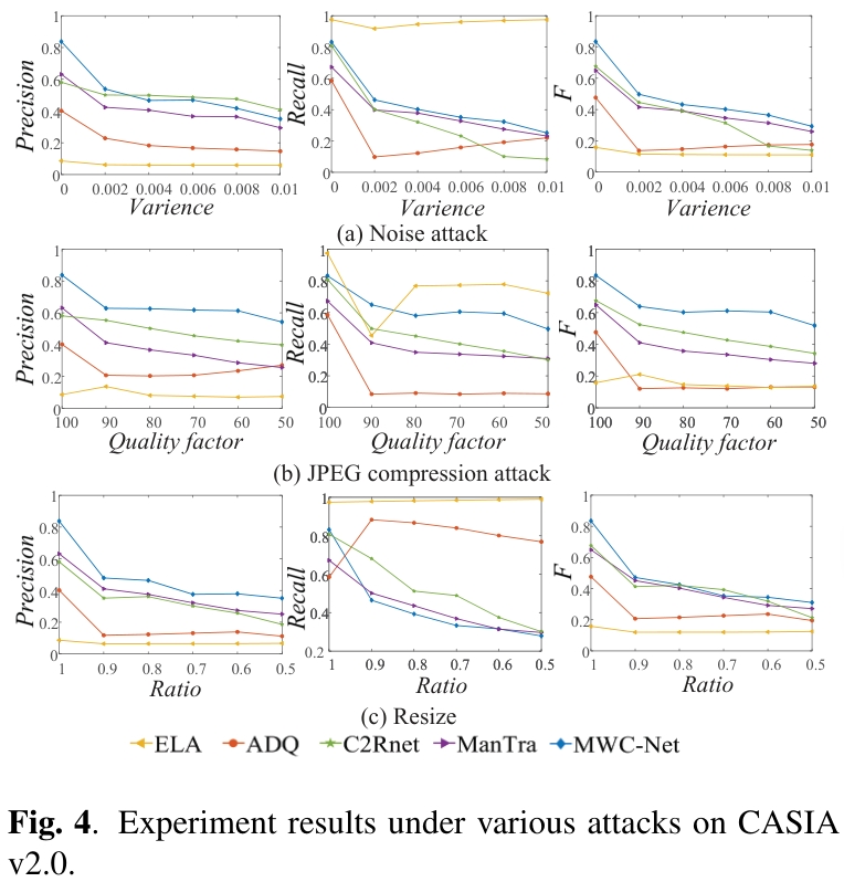 如图所示,前面两个ADQ和ELA是传统方法,后面两个是深度学习的方法,作者提到传统方法的召回率都比较高的原因是,它们可以将整个图片都作为篡改区域进行检测,因此可以更好的识别到正例,但是precision就不行。
