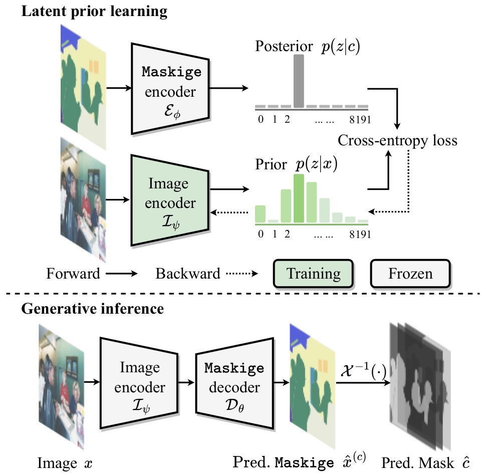 如图所示,上面部分为Latent Posterior Learning的过程,潜在先验学习,下面为Generative inference生成推理的示意图。在训练过程中,对于潜在先验学习,作者优化图像编码器$\mathcal{I}\psi$同时冻结maskige编码器$\mathcal{E}\psi$,目的是最小化隐藏token的先验分布和后验分布之间的差异(文中用交叉熵损失来计算);而在生成阶段,使用图像编码器$\mathcal{I}_\psi$得到的先验分布经过maskige解码器得到maskige和预测掩码。